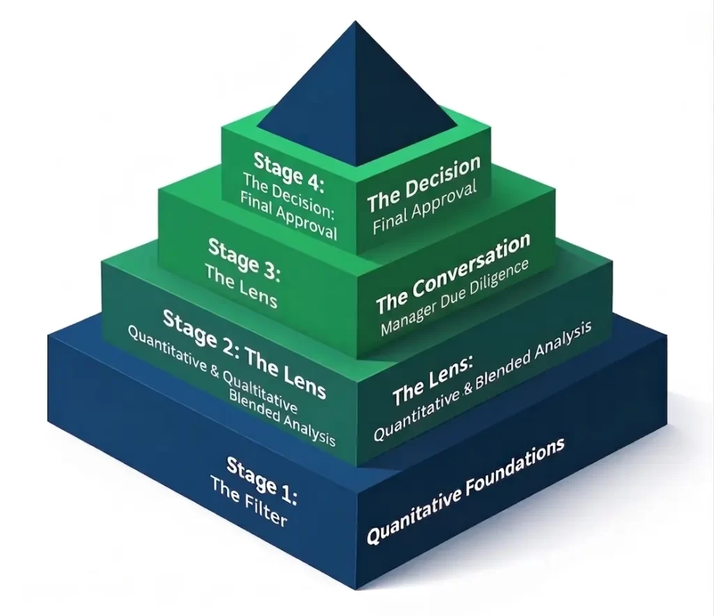 Stage 3 is where quantitative scores are either validated or overturned through direct engagement with fund managers. This is not a formality — it’s a critical checkpoint.